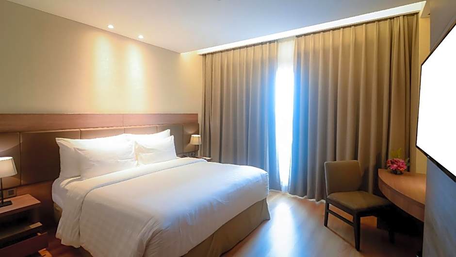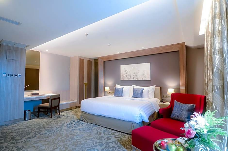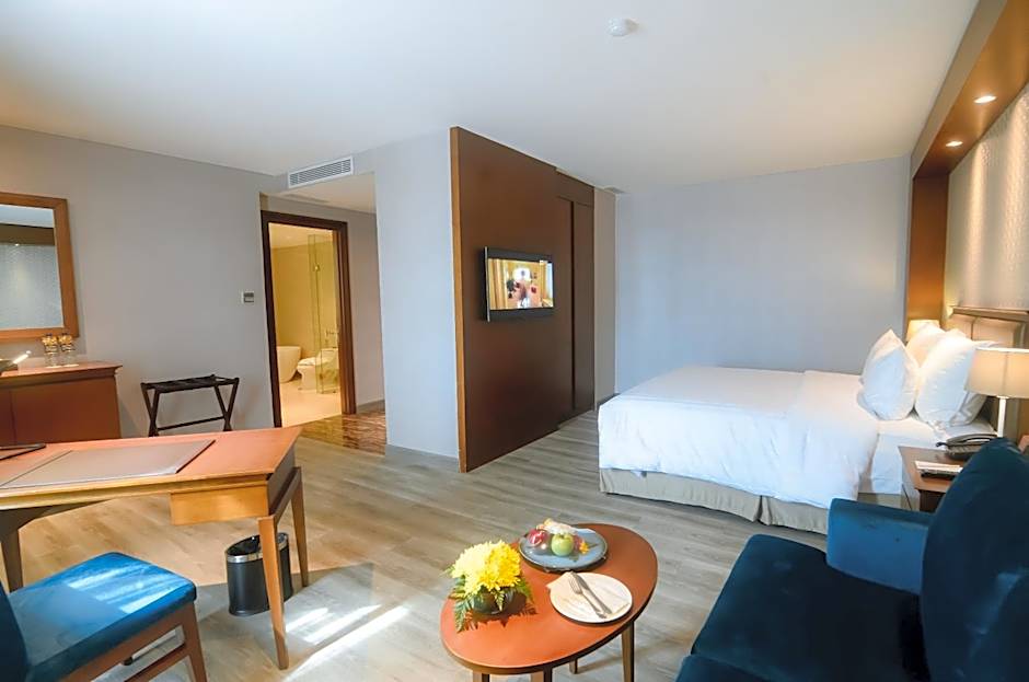 This suite has a satellite TV, bathrobe and tile/marble floor.